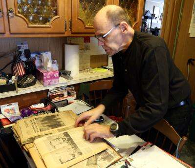 Dr. Eugene E. Laigon Jr., grandson of rescued miner Joseph Laigon, stands at his kitchen table and sifts through original news stories and memorabilia from the 1915 Foster's Tunnel Mine Cave-In. DONALD R. SERFASS/TIMES NEWS