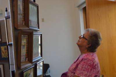 Above, Catherine White enjoys the art work of several local artists during Sunday's show at the Osprey House in Slatington. Left,
