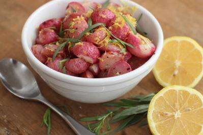 It's just that it would be nice to offer something ... different. So we'll help you with this one. Try our butter roasted radishes with tarragon and lemon. It's a simple dish that comes together in minutes, but has a wonderful flavor that is both rich and light and lemony - the perfect combination for spring.Butter Roasted Radishes with Tarragon and LemonStart to finish: 30 minutes (10 minutes active)Servings: 62 pounds radishes, halved3 tablespoons butter, meltedKosher salt and ground black pepperZest of 1 lemon2 tablespoons chopped fresh tarragonHeat the oven to 375 F.Pile the radish halves in the center of a rimmed baking sheet. Drizzle with the butter and toss to coat. Sprinkle with salt and pepper. Roast for 20 minutes, or until tender and lightly browned. Arrange on a serving platter, then sprinkle with the lemon zest and tarragon. Serve warm or at room temperature.Nutrition information per serving: 80 calories; 50 calories from fat (63 percent of total calories); 6 g fat (3.5 g saturated; 0 g trans fats); 15 mg cholesterol; 220 mg sodium; 5 g carbohydrate; 2 g fiber; 3 g sugar; 1 g protein.