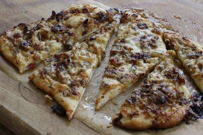Once, when I knew in advance that I couldn't be there for one of her upcoming appearances, I invited a pal of mine - a culinary professional - to try out for the gig. We prepped the food as usual, and at the end of the day I thought my friend had done a dandy job. Julia flatly disagreed and said she wouldn't hire her. I was flabbergasted."Why not?" I asked."Because she sliced the onions the wrong way," Julia replied.Yikes! I simply hadn't focused on how my friend sliced the onions. I didn't think this detail was that important. But all these years later, I realize Julia was right. Exactly how you slice an onion makes a difference. So does how you cook it.Everyone knows that chopping onions can literally bring tears to your eyes. Here's why. When an onion's cells are ruptured, they give off pungent sulfur fumes. The more roughly an onion is treated - such as when it is chopped with a dull knife or pulsed in a food processor - the more fumes it gives off.There are any number of quaint folk remedies for this problem. Put a piece of bread in your mouth while you're chopping. Do your chopping near a running faucet. And so on. None of them works.What does work - at least when you're chopping up a lot of onions - is wearing onion goggles. Modeled on welder's goggles, these babies prevent the onion's fumes from reaching your eyes. But the best everyday tactic is to chop or slice the onion quickly and with a very sharp knife. Chilling the onion for an hour or two ahead of time also is a good idea.Having managed to blunt an onion's ability to bring you to tears, let's turn to the correct way to slice one, a la Julia. Lengthwise, not crosswise, is the way to roll. Cutting an onion in half through the root end and then slicing it from stem to stern stimulates far fewer sulfur fumes. These lengthwise slices also happen to hold together much better than crosscut slices, precisely because you've sliced with the grain instead of against it. This is especially important for a dish like onion soup, when you want the slices to maintain their shape.Finally, we come to how to cook an onion, which affects not just the flavor of the onion, but of the whole dish. If you throw it into a hot pan and quickly saute it over high heat, the onion and the dish it's added to will be bland. If you do it slowly over low heat, you'll maximize the onion's flavor.All of these tips apply to making my Alsatian onion pie. The French call it tarte flambee. The Germans call it Flammkuchen. It strikes me as more like a pizza than anything else. I tasted it for the first time on a river cruise in France a couple years ago, and I was really knocked out by its combination of simplicity and big flavor. Accompanied by a fresh salad, this treat would make the perfect light supper for the beginning of spring.Alsatian Onion PieStart to finish: 1 hour 15 minutesMakes three 10- to 12-inch pizzas6 ounces bacon, thinly sliced crosswise4 cups thinly sliced yellow onionKosher salt and ground black pepper8 ounces creme fraiche1 large egg yolkPinch nutmeg1½-pound ball purchased pizza dough, room temperature3 ounces coarsely grated Gruyere cheeseIn a large skillet over medium, cook the bacon, stirring, until it starts to brown, 5 to 8 minutes. Transfer the bacon to paper towels to drain and pour off all but 2 tablespoons of the fat from the skillet. Return the skillet to medium heat and add the onions. Cook, covered, stirring occasionally, until very soft, about 10 minutes. Remove the cover and cook, stirring occasionally, until golden, about another 30 minutes. Season with salt and pepper, then set aside.Heat the oven to 500 F. Arrange one of the oven racks on the oven's bottom shelf.In a small bowl, stir together the creme fraiche, egg yolk, nutmeg and a pinch each of salt and pepper.Divide the dough into 3 even pieces. On a lightly oiled surface, roll out each piece into a 10-by-12-inch rectangle about 1/8-inch thick. Transfer each to a 15-by-17-inch sheet of kitchen parchment. The dough may shrink and lose its shape. If so, roll it again on the parchment.One at a time, transfer each piece of parchment and dough to a bak sheet (unless your oven can fit 2 sheets on one shelf, you'll need to bake these one at a time). Spread a third of the creme fraiche mixture over the piece of dough on the baking sheet, then top with a third of the onions and bacon. Sprinkle with a third of the cheese, then bake on the oven's lower shelf for 10 minutes, or until the crust is crisp. Repeat with remaining dough and toppings. Serve right away.Nutrition information per half pizza: 640 calories; 310 calories from fat (48 percent of total calories); 35 g fat (16 g saturated; 0 g trans fats); 120 mg cholesterol; 1260 mg sodium; 60 g carbohydrate; 4 g fiber; 6 g sugar; 17 g protein.