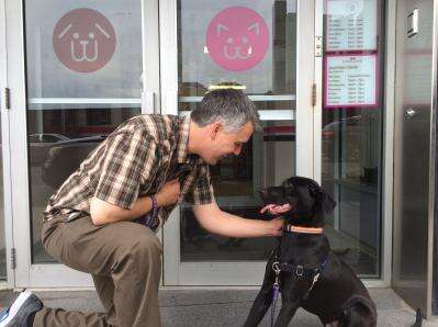Longtime trainer and associate director of adoptions and resident care Mike Rueb, left, and Clay, a 9-month-old black lab mix, are shown outside the Bideawee pet center in New York. Bideawee is a 112-year-old no-kill shelter in Manhattan. No-kill shelters like Bideawee offer an alternative for animals whose owners cannot care for them. AP PHOTO Copyright - ©2015 Mark McQueen, phoDOGrapher, All Rights Reserved