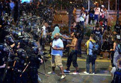 CHARLOTTE, N.C. (AP) - Violent protesters rampaged through parts of downtown Charlotte as anger continued to build over the deadly police shooting of a black man and the wildly different stories about what happened from authorities and the victim's family and neighbors.