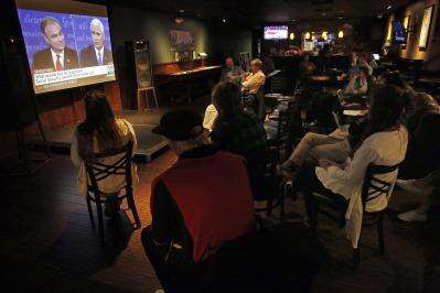 Students and faculty watch the Vice Presidential debate during a watch party at Walker's Pub, on the campus of Regis University, a private Jesuit university in Denver, Colo., Tuesday, Oct. 4, 2016. (AP Photo/Brennan Linsley) Copyright - Copyright 2016 The Associated Press. All rights reserved.