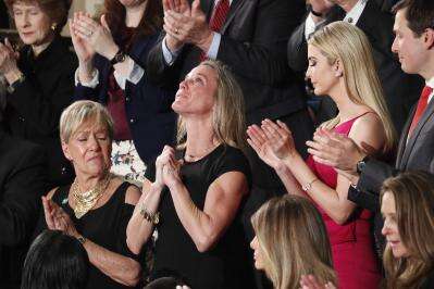 Democrats and Republicans alike stood for minutes to applaud Carryn Owens, giving her the loudest cheers of the night in a rare moment of unity during President Donald Trump's first speech to a joint session of Congress. Her husband, Senior Chief William "Ryan" Owens, was killed last month in a raid approved by Trump, a decision that has been sharply criticized by some - including the slain SEAL's father - and which Trump continued to defend Tuesday night.Trump, near the end of his hour-long speech, paid tribute to Carryn Owens, a surprise guest whose presence in the first lady's box was not announced in advance by the White House."The challenges we face as a nation are great. But our people are even greater. And none are greater or braver than those who fight for America in uniform," said Trump, who said they were "blessed" to be joined by Owens.The president then turned to the balcony where Owens sat next to Trump's daughter, Ivanka, and said "Ryan died as he lived: a warrior, and a hero - battling against terrorism and securing our nation."The chamber roared with cheers as Owens stood and cried, creating what would likely become the signature moment of Trump's address.But Owens' death, as well as the killing of several civilians, has raised questions about the effectiveness of the raid, and Trump took a moment to again litigate the decision. He quoted Defense Secretary Jim Mattis defending the action, saying "Ryan was a part of a highly successful raid that generated large amounts of vital intelligence that will lead to many more victories in the future against our enemies.""Ryan's legacy is etched into eternity," Trump said. "For as the Bible teaches us, there is no greater act of love than to lay down one's life for one's friends. Ryan laid down his life for his friends, for his country, and for our freedom - we will never forget him."He also struck an awkward note, saying that the prolonged ovation would have made Carryn's slain husband "very happy, because I think he just broke a record" for applause.Carryn Owens cheered the president's remarks. But Owens' father, Bill, has denounced the raid that took his son's life and refused to meet with Trump when the president greeted the Navy SEAL's remains when they were returned to the United States. He told the Miami Herald last weekend that the raid was a "stupid mission" and called for an investigation."Don't hide behind my son's death to prevent an investigation," the elder Owens warned Trump. He did not attend the speech.---Follow Lemire on Twitter at