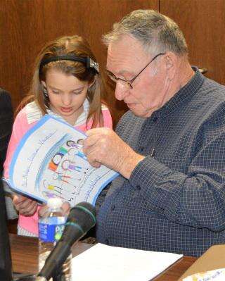 First-grader Morgan Hyland reads aloud from her chapter book to school board director Delbert Zacharias. JUDY DOLGOS-KRAMER/TIMES NEWS