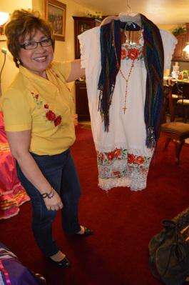 Reyna Gonzalez shows off the costume of her state, Merida Yucatén, Mexico. The set, which includes the blouse, skirt and shawl as well as the rosary, is called "terno." In Mexico, on holidays people gather to dance wearing the costumes from their particular states. KAREN CIMMS/TIMES NEWS