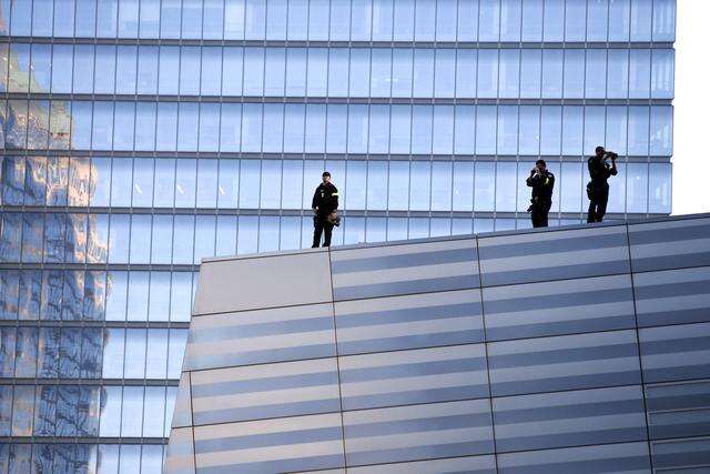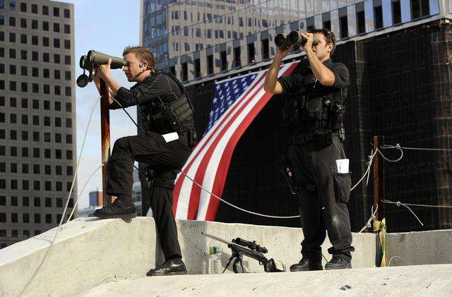 FILE - In this Sept. 27, 2014 file photo, a sniper team stands watch during a visit by the prime minister of India to the National September 11 Memorial, in New York. A Las Vegas shooting from a high-rise hotel that killed dozens of people in a packed concert below on Sunday, Oct. 1, 2017, has forced other cities to examine their tactics for dealing with this kind of nightmare scenario. In New York, which hosts Times Square New Year's Eve and other events surrounded by high-rises, police say they use rooftop snipers to scan for threats, and make security sweeps of nearby hotels. (AP Photo/Jason DeCrow, File)