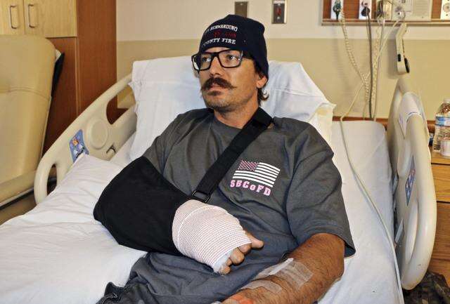 Mike Kordich, a firefighter from Rancho Cucamonga, Calif., answers questions from his hospital bed at Sunrise Hospital in Las Vegas, Tuesday, Oct. 3, 2017. Kordich was giving a severely injured person CPR when he was hit by a bullet after a gunman opened fire on an outdoor music concert on Sunday. (AP Photo/Robert Ray)