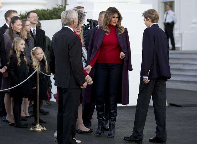 The first lady, wearing a holiday red turtleneck and a coat draped over her shoulders, and Barron, in a dark suit coat, white shirt and dark slacks, emerged from the North Portico. They circled the tree and walked over to Jim and Diane Chapman, who presented it. The Chapmans own a Wisconsin Christmas tree farm and won an annual contest sponsored by the National Christmas Tree Association.