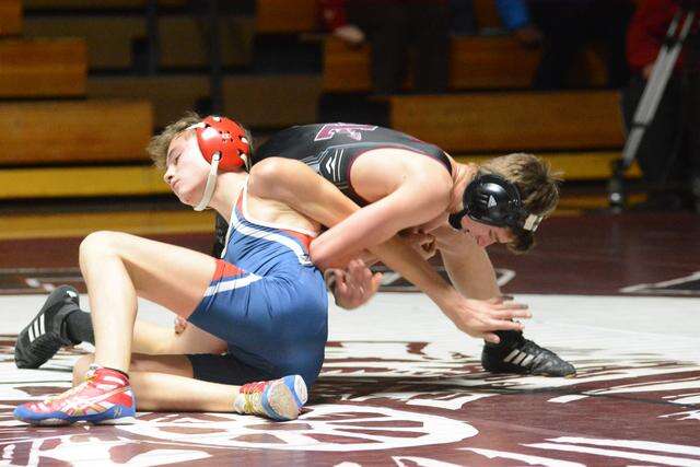 Junior Keven Madea hung on for a 3-2 decision over Jim Thorpe’s Andrew Eisenhardt at 120 pounds to kick off a string of five straight wins for the Indians to close out the match and seal the win.