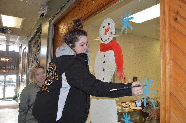 Emilee Kwaak, right, adds snowflakes to a snowman she painted along with Olivia Dacey inside the Panther Valley mini mall.