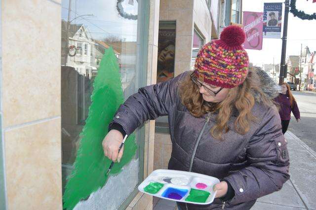 Rachel Strohl paints a Christmas tree on the window of a business on Ridge Street in Lansford. CHRIS REBER/TIMES NEWS