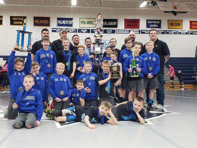 The Palmerton youth wrestling team recently wrapped up an outstanding season with its third consecutive King of the Ridge title and its fifth overall. The King of the Ridge championship concluded a campaign in which the Blue Bombers went 14-1 in regular season dual meets in the Valley Elementary Wrestling League, won their division for first time in program history, and finished 4th overall in a league of 36 teams. There were also plenty of Individual highlights for Palmerton. In the King of the Ridge Tournament, Connor Hibbell was named The Outstanding Wrestler by the referees for his overtime win in the 69-pound championship bout. The Bombers also had a number of strong performances in the Valley Elementary League tournaments. In the novice tournament, Trentin Pasquariello and Dominic Pereira placed first; Christopher Wells took third; and Owen Fox placed fourth. In the JV tournament, the Bombers’ Aiden Ortiz placed first; and TK Gursky finished third. In the varsity tournament, Palmerton got a fourth-place finish from Josh Merke; a sixth-place finish from Ben Negley; and seventh place finishes from Ashton Solt and Dillon Anthony.