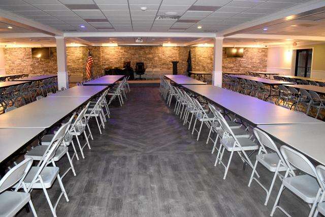 The meeting room upstairs, which can seat 40, has new flooring, wainscoting, paint and LED lights on dimmers.