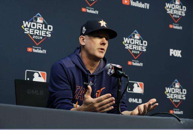 FILE - In this Oct. 28, 2019, file photo, Houston Astros manager AJ Hinch talks to the media during a news conference for baseball's World Series, in Houston. Houston manager AJ Hinch and general manager Jeff Luhnow were suspended for the entire season Monday, Jan. 13, 2020, and the team was fined $5 million for sign-stealing by the team in 2017 and 2018 season. Commissioner Rob Manfred announced the discipline and strongly hinted that current Boston manager Alex Cora — the Astros bench coach in 2017 — will face punishment later. Manfred said Cora developed the sign-stealing system used by the Astros. (AP Photo/Eric Gay, File)