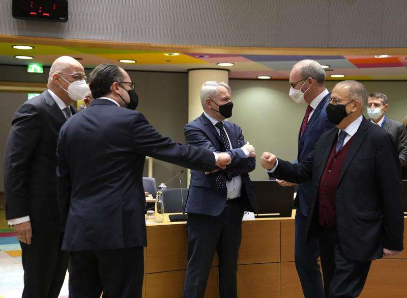 Austrian Foreign Minister Alexander Schallenberg, second left, greets Cypriot Foreign Minister Ioannis Kasoulides, right, during a meeting of EU foreign ministers at the European Council building in Brussels, Monday, Jan. 24, 2022. European Union foreign ministers are aiming Monday to show a fresh display of resolve and unity in support of Ukraine, amid deep uncertainty about whether President Vladimir Putin intends to attack Russia's neighbor or send his troops across the border. (AP Photo/Virginia Mayo)