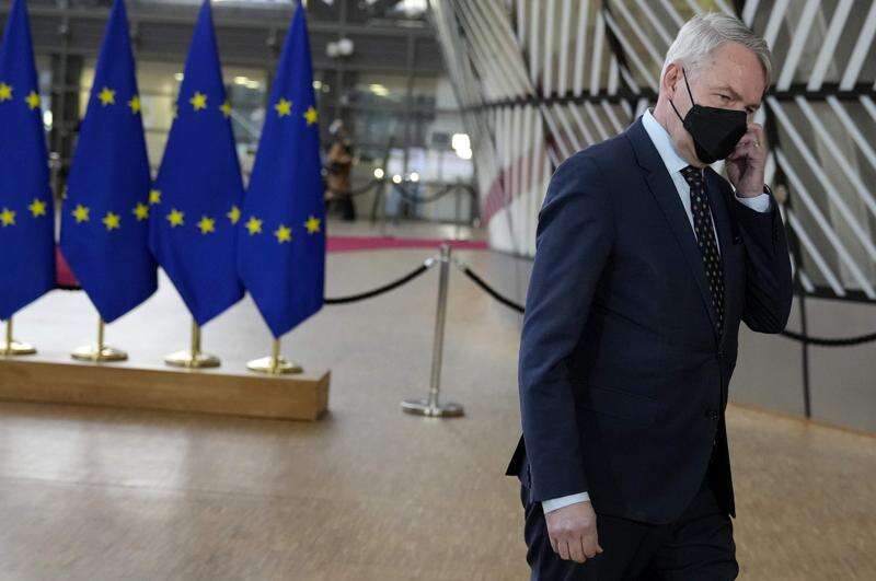 Finland's Foreign Minister Pekka Haavisto arrives for a meeting of EU foreign ministers at the European Council building in Brussels, Monday, Jan. 24, 2022. European Union foreign ministers are aiming Monday to show a fresh display of resolve and unity in support of Ukraine, amid deep uncertainty about whether President Vladimir Putin intends to attack Russia's neighbor or send his troops across the border. (AP Photo/Virginia Mayo)
