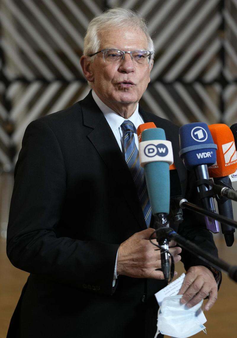 European Union foreign policy chief Josep Borrell speaks with the media as he arrives for a meeting of EU foreign ministers at the European Council building in Brussels, Monday, Jan. 24, 2022. European Union foreign ministers are aiming Monday to show a fresh display of resolve and unity in support of Ukraine, amid deep uncertainty about whether President Vladimir Putin intends to attack Russia's neighbor or send his troops across the border. (AP Photo/Virginia Mayo)