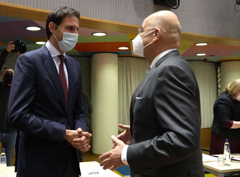 Dutch Foreign Minister Wopke Hoekstra, left, speaks with Greek Foreign Minister Nikos Dendias during a meeting of EU foreign ministers at the European Council building in Brussels, Monday, Jan. 24, 2022. European Union foreign ministers are aiming Monday to show a fresh display of resolve and unity in support of Ukraine, amid deep uncertainty about whether President Vladimir Putin intends to attack Russia's neighbor or send his troops across the border. (AP Photo/Virginia Mayo)