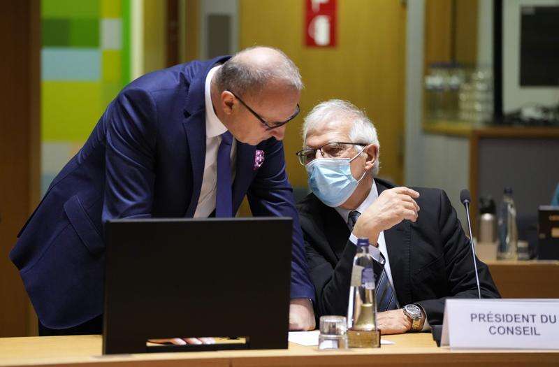 European Union foreign policy chief Josep Borrell, right, speaks with Croatia's Foreign Minister Gordan Grlic Radman during a meeting of EU foreign ministers at the European Council building in Brussels, Monday, Jan. 24, 2022. European Union foreign ministers are aiming Monday to show a fresh display of resolve and unity in support of Ukraine, amid deep uncertainty about whether President Vladimir Putin intends to attack Russia's neighbor or send his troops across the border. (AP Photo/Virginia Mayo)