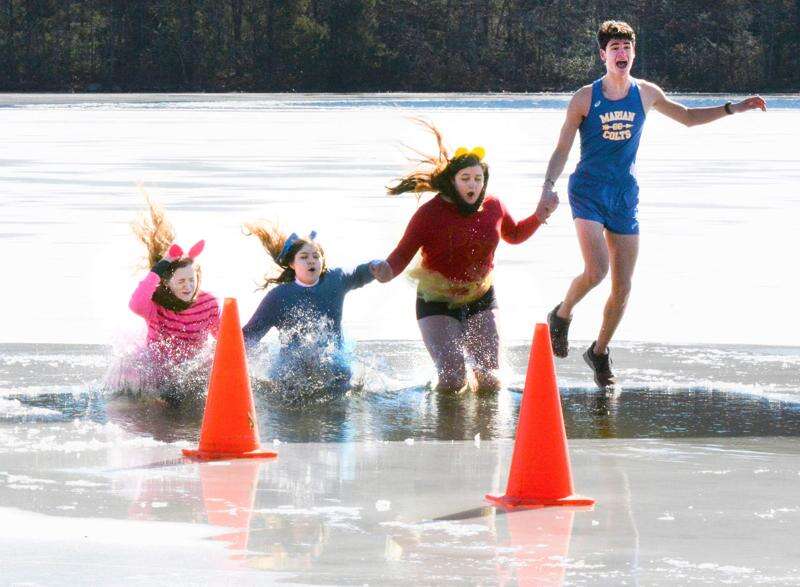 Marian Catholic High School students, from left, Desiree Miloth, Haley Curnow, Gabriella Greek and Maxwell Schwabe hold hands as they jump into Mauch Chunk Lake during the eighth annual Polar Plunge last January. TIMES NEWS FILE PHOTO