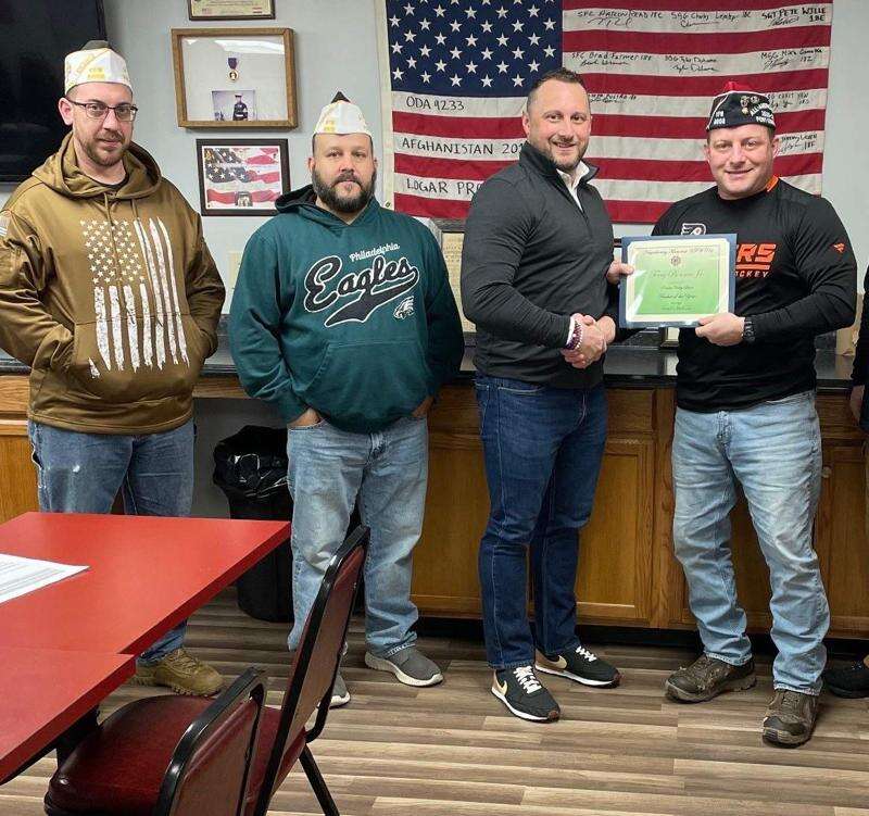 Terry Bonner Jr., second from right, accepts this year's Nesquehoning VFW Memorial Post 8008's Teacher of the Year award from Commander Craig Strohl, right. With him are VFW members Ian Acciarito and Tim Delaney. CONTRIBUTED PHOTO