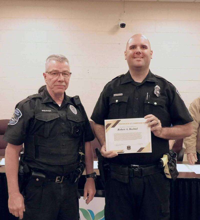 Rush Township Police Chief Rick Weaver presented a Certificate of Commendation to Sgt. Robert Bechtel, who was honored for saving the life of Michael Williams of Hazleton in a motorcycle crash. JAMES LOGUE JR./SPECIAL TO THE TIMES NEWS