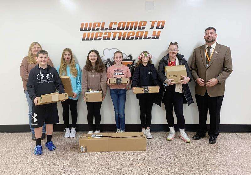 Amazon AVP1 of Hazleton recently presented Weatherly students from science teacher Erin DiGennaro’s class with tools and competition supplies (balsa wood, wood dowels, project kits, etc.) worth $500. From left: Tammy Kates of Amazon AVP1, Noah Maranyuk, Lily Keiper, Jillian Esposito, Elizabeth DiGennaro, Trinity Spence, Rayelle Hughes of Amazon AVP1, and Weatherly Superintendent Daniel Malloy. SETH ISENBERG/SPECIAL TO THE TIMES NEWS