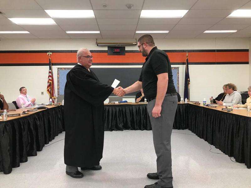 Magisterial District Judge Joseph D. Homanko Sr., left, swears in Ryan Binder as a new member of the Weatherly Area School District board of directors. SETH ISENBERG/SPECIAL TO THE TIMES NEWS