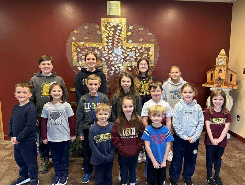 St. Jerome Regional School, Hometown, recently named the Christian of the Month students for January 2024. They are, front row, from left, Cooper Boyle, kindergarten blue; Mattea Sanfilippo, kindergarten gold; and Erik Lutz, preschool. Second row, Radly Ahearn, first grade gold; Teresa Mehlig, second grade blue; Brayden Slane, fourth grade gold; Brynn Hannis-Miskar, third grade; Jackson Nothstein, fourth grade blue; Riley Garvey, second grade gold; and Charlotte Harvey, first grade blue. Third row, Evrett Angelo, sixth grade; Cara Rehnert, eighth grade; Ella Bones, seventh grade; and Kendall Peiser, fifth grade. The Christian of the Month Award recognizes students who display good character on a consistent basis and serve as student role models throughout the month. Students are nominated by their teachers based on the six pillars of character: trustworthiness, respect, responsibility, fairness, caring, and citizenship. CONTRIBUTED PHOTO