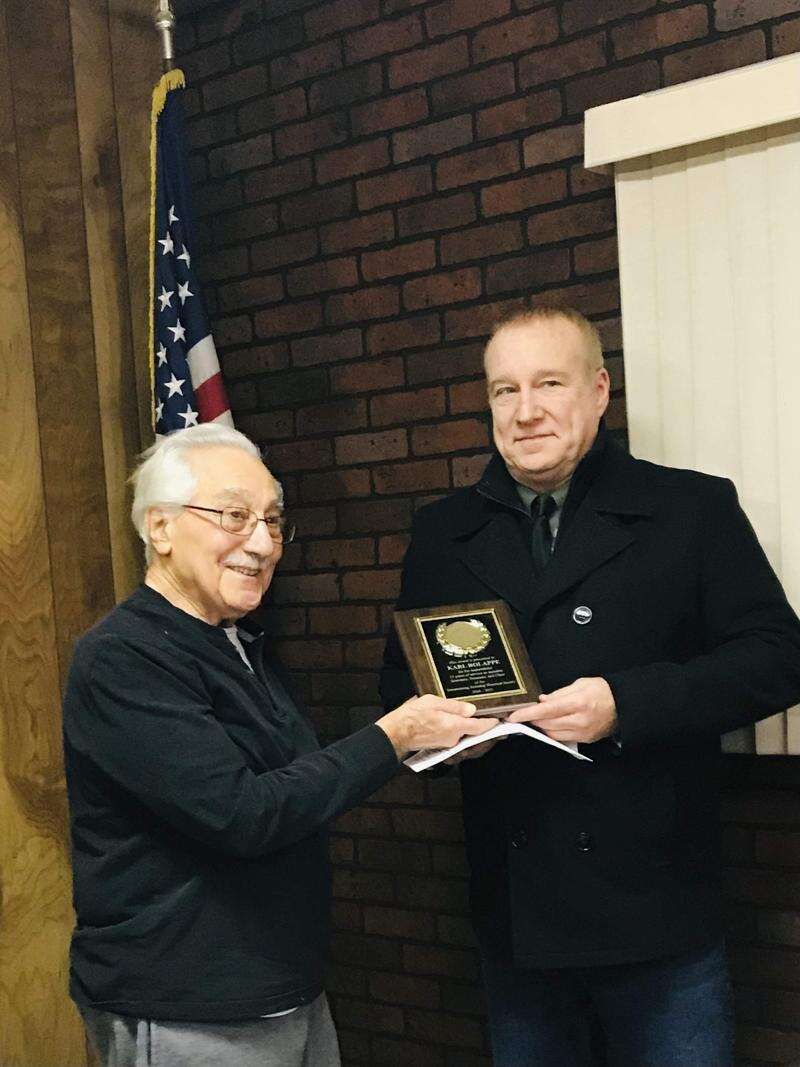 The Historical Commission's Donald Bonet, left, presents an award to Karl Rolappe for his service on the commission. LORI COOPER/SPECIAL TO THE TIMES NEWS