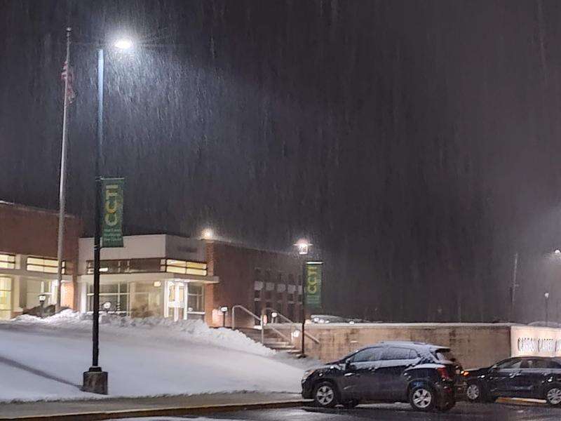 Light snow falls outside the Carbon Career & Technical Institute, Jim Thorpe, on Thursday night. Snow is a possibility again tonight, with forecasters saying we'll get anywhere from 1 to 4 inches. JAMES LOGUE JR./SPECIAL TO THE TIMES NEWS