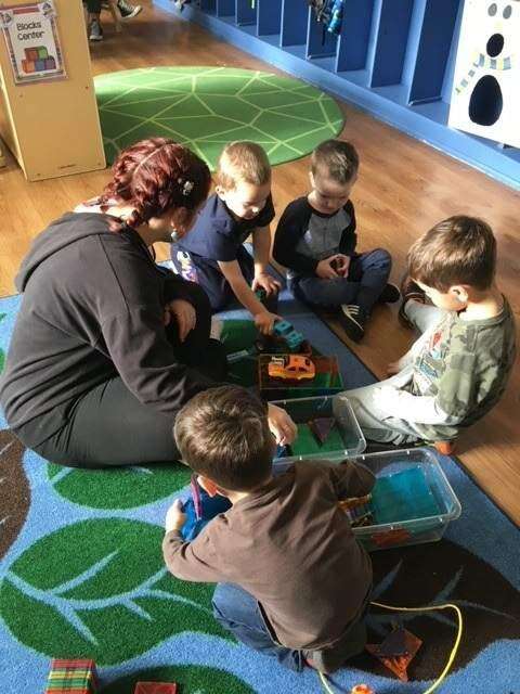 Left: CCTI Interact Rotary Club member Brooklynne Winger works with pre-schoolers at the Lehigh Valley Children's Centers' Early Childhood and Daycare Center at St. Joseph's Academy in Jim Thorpe on Feb. 20. Members of the club, a Rotary International service club for students, hope to provide activities that promote pre-reading and math skills on a regular basis at the center.