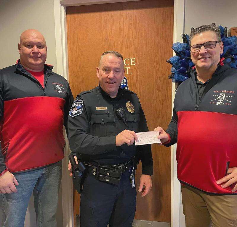 Charles Whitehead, left, and Todd Truskey, right, co-captains, presented a $500 check from The Jim Thorpers Bicycle Team to Jim Thorpe Police Chief Joseph Schatz for equipment to upfit the new police e-bikes. Many team members regularly ride the trail through the borough and this will allow the department to assist cyclists in the case of emergencies and to patrol the trail. The e-bikes will also allow officers to maneuver through the downtown when it is congested with traffic and tourists. CONTRIBUTED PHOTO