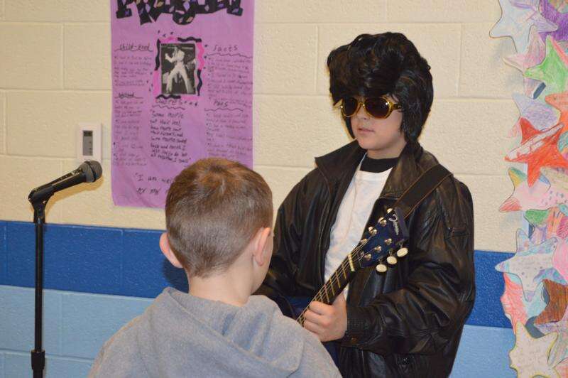 Towamensing Elementary sixth-grader Charlie Coombe brings Elvis Presley to life for a fellow student Thursday during a Living Wax Museum project. Students researched a biography of their choice and were tasked with bringing that person to life in a 30-second speech. JARRAD HEDES/TIMES NEWS