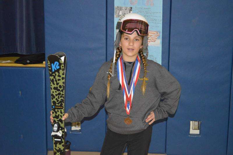 Mackenzie Spalding, a Towamensing Elementary sixth-grade student, portrays Lindsey Vonn during the school's annual Living Wax Museum project on Thursday. JARRAD HEDES/TIMES NEWS