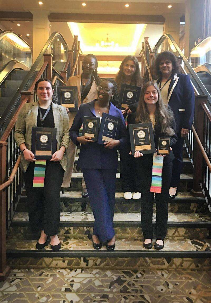 Five members of Pleasant Valley High School's FBLA chapter won first place at the State Leadership Conference to become state champions in their categories. In the front row from left to right, they are Katelyn Honadel, Anayah Accilien and Briana Palmieri. In the second row, they are from left to right, Michael Clement St Louis, Lillian Erhardt, with the PV-FBLA adviser Denise Hopely. CONTRIBUTED PHOTO