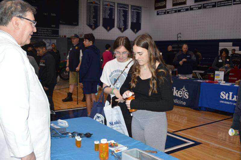 Elsewhere in the high school gymnasium, sophomores Rhyan Heintzleman and Amyah Fisher stopped by the table of Bechtel’s Pharmacy Inc.