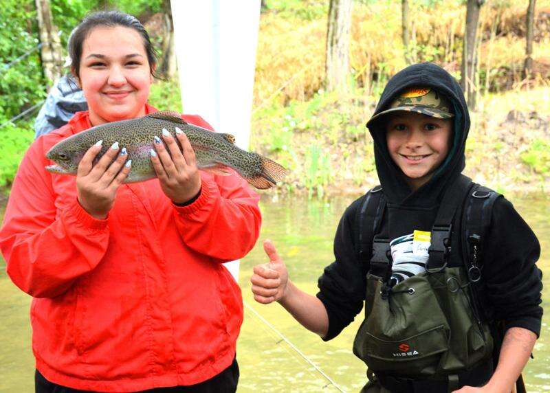 Sophia Natividad of Palmerton, left, shows off 17-inch rainbow trout she caught during fishing derby Friday at the Germantown Fishing Club for special needs and disadvantaged children. At right is Carter Reis, a volunteer at the derby.
