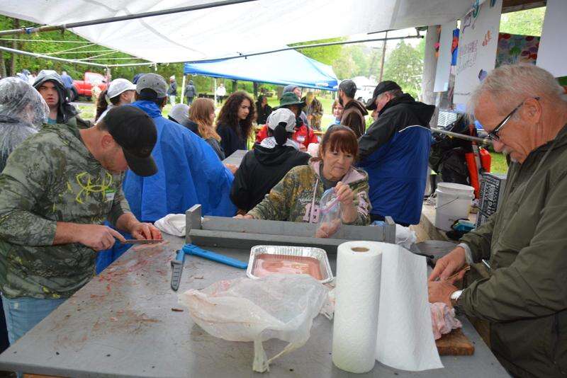 Members of the Germantown Fishing Club, from left, Derick Reis, Marlene Shoop and Farley Foster, clean and filet fish caught by special needs and disadvantaged children during 69th annual fishing derby at the club.