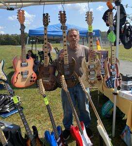 Fred Heller has been making guitars as a hobby for 15 years and had his hand carved one piece, semi hollow and solid body guitars for sale. His wife Lori has been selling shirts, pennants, homemade ornaments and signs for 18 years.