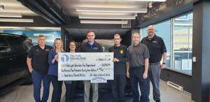 Pictured from left, are Rodney Fritzinger, sales associate, Kim Guth, internet sales manager BDC, Chelsea Morgan, title clerk, Greg Rentschler, co-owner, Robert Reph, Slatington Fire Chief, Lance Strohl, Slatington firefighter, Dan Morris, finance manager. The total donation was $2,242. The Slatington Fire Department is hoping to have a new building.