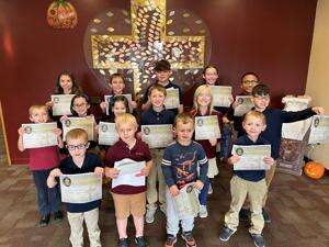 The Christian of the Month students at St. Jerome Regional School in Hometown for October are, front, from left, Wyatt Krajcirik, Kindergarten Gold; Carter Malafarina, Kindergarten Blue; Jordan Taylor, preschool; and Carter Stephens, 1 Blue. Second row, Liam Sullivan, 1 Gold; Lacey Dever, 3 Blue; Skye Steffy, 2 Gold; Jace Stephens, 2 Blue; Emily Lutz, 5 Blue; and Ulysses Fitzpatrick, 3 Gold. Back, Brynn Hannis-Miskar, 4th Grade; Aiden Barrett, 6th Grade; Levi McCullion, 8th Grade; Lillian Porambo, 7th Grade; and Carlos Martinez, 5 Gold. The Christian of the Month Award recognizes students who display good character on a consistent basis and serve as student role models throughout the month. CONTRIBUTED PHOTO