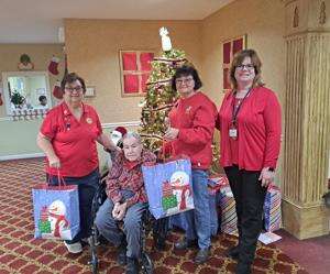 American Legion Auxiliary Unit 360 members delivered Christmas presents to 10 veterans on Sunday to Heritage Hill Senior Community and 23 veterans at Forest Hills Rehabilitation and Healthcare Center, both in Weatherly. Each Christmas bag contained a blanket, socks, a pen, deodorants, body wash, two treats and a Christmas card. At Heritage Hill, from left to right, ALA members Judy Desrosiers and Georgia Farrow present veteran Clinton Zimmerman with Christmas presents. Denise Kuls, from Activities, is pictures with them. Christmas bags were also given to nine other veterans at Heritage Hill. CONTRIBUTED PHOTO