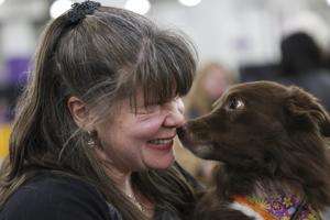 Katrina Wallace poses for a photo with her mixed breed, Beatrice, at the 149th Westminster Kennel Club Dog show on Saturday in New York City. AP PHOTO/HEATHER KHALIFA