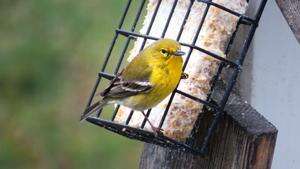 A pine warbler visits a suet block in Slatington recently. Suet is a big attraction for migrating birds. Some warblers are stopping as they migrate through the northern areas. Some will remain in Pennsylvania to breed until it’s time to head south for the winter. BARRY REED/SPECIAL TO THE TIMES NEWS