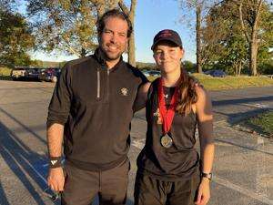 Northwestern senior Mallory Conner poses with coach Brian Bleam following her run to the District 11 Class 2A singles final. PATRICK MATSINKO/TIMES NEWS