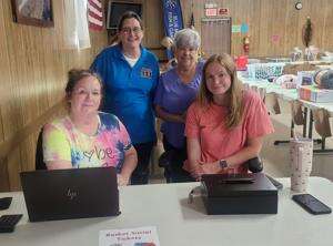 R.W. Fritzinger, VFW Post 7215 Auxiliary of Walnutport had their annual basket and bake sale event last Saturday. Front, from left, are: Pat Walker, auxiliary treasurer and Faith Ohl, member, who sold the tickets for the basket raffle. Back row, from left, are: Karen Bandzi, auxiliary president and Donna Seiler, trustee. They spent months collecting items for 99 baskets and 131 gift cards. Proceeds from the bake sale were donated to Relay for Life which is used for Cancer research, patients support services and support advocacy. PATRICIA iNGLES/SPECIAL TO THE TIMES NEWS