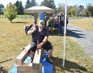 Russell “Rusty” Burger was there to demonstrate how beam work was done years ago with wooden pegs. He had a photo album of pictures of the last pegged barn built in Polk Township in 1995 by he and his late father.