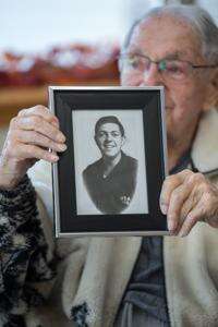 Left: Franklin Frable holds a photo of him during his time in the military.